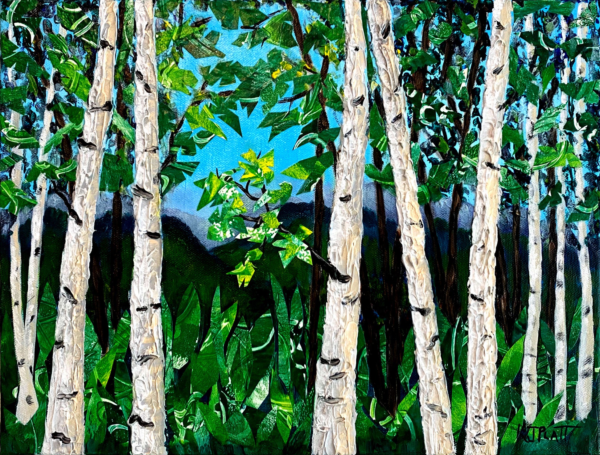 "Aspen Grove" is a lovely setting of aspen trees and lots of lots of leaves. The soft mountains in the background give a nice contrast to the textured aspens in the foreground.