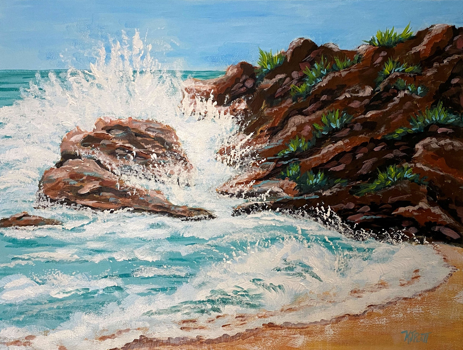 A moment frozen in time - the exact instant a wave meets resistance. This original painting captures the raw force of nature as water crashes against stone, embodying both tension and release. Bold textures and vivid contrast draw the eye to the impact zone, where movement and stillness collide.