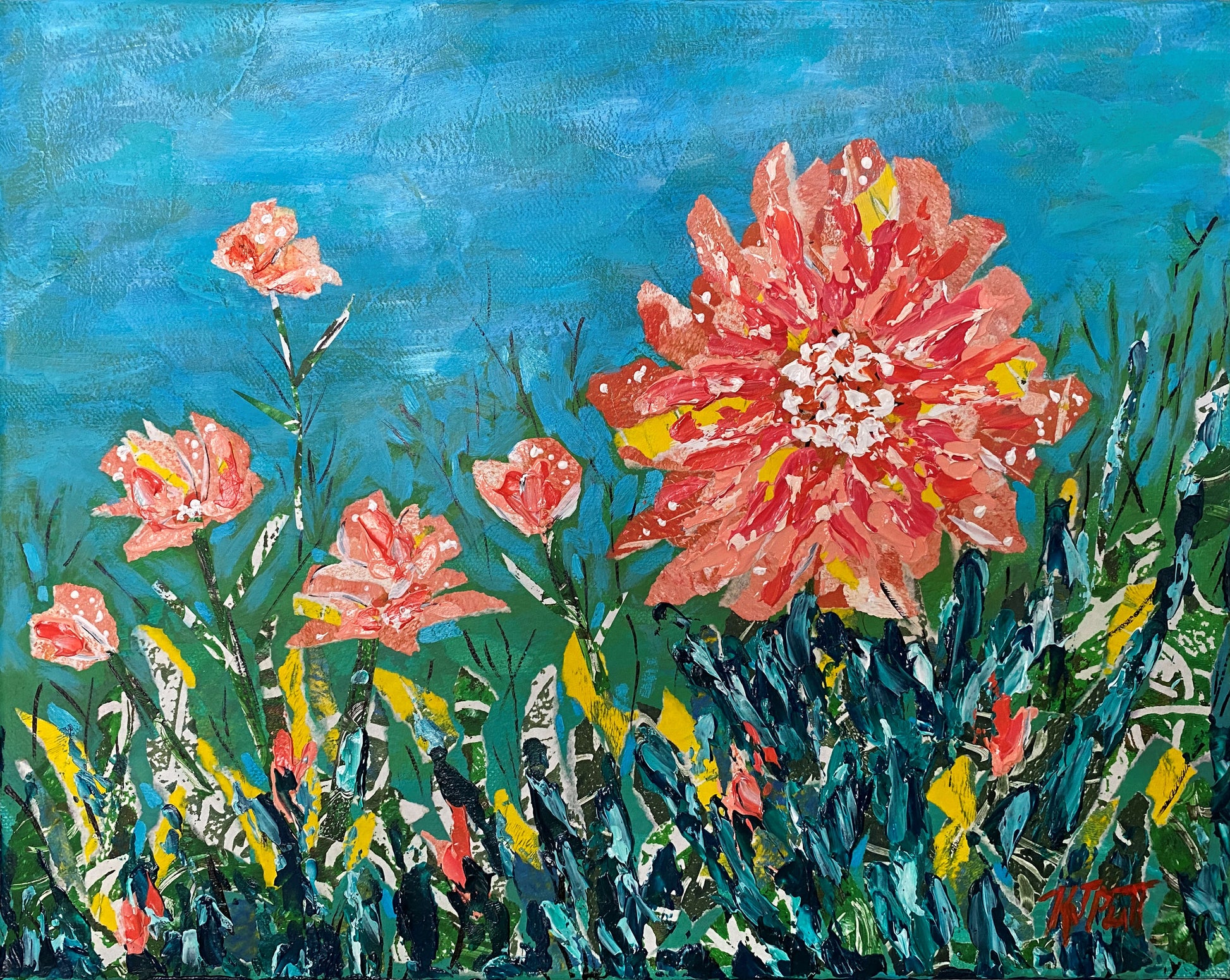 Sometimes, all it takes is a quiet moment to hear what nature has to say. This piece bloomed from a place of joyful experimentation with paint, palette knife, hand painted collage papers, and a love for bold color and texture. The center flower insisted on being the star… I just followed its lead.